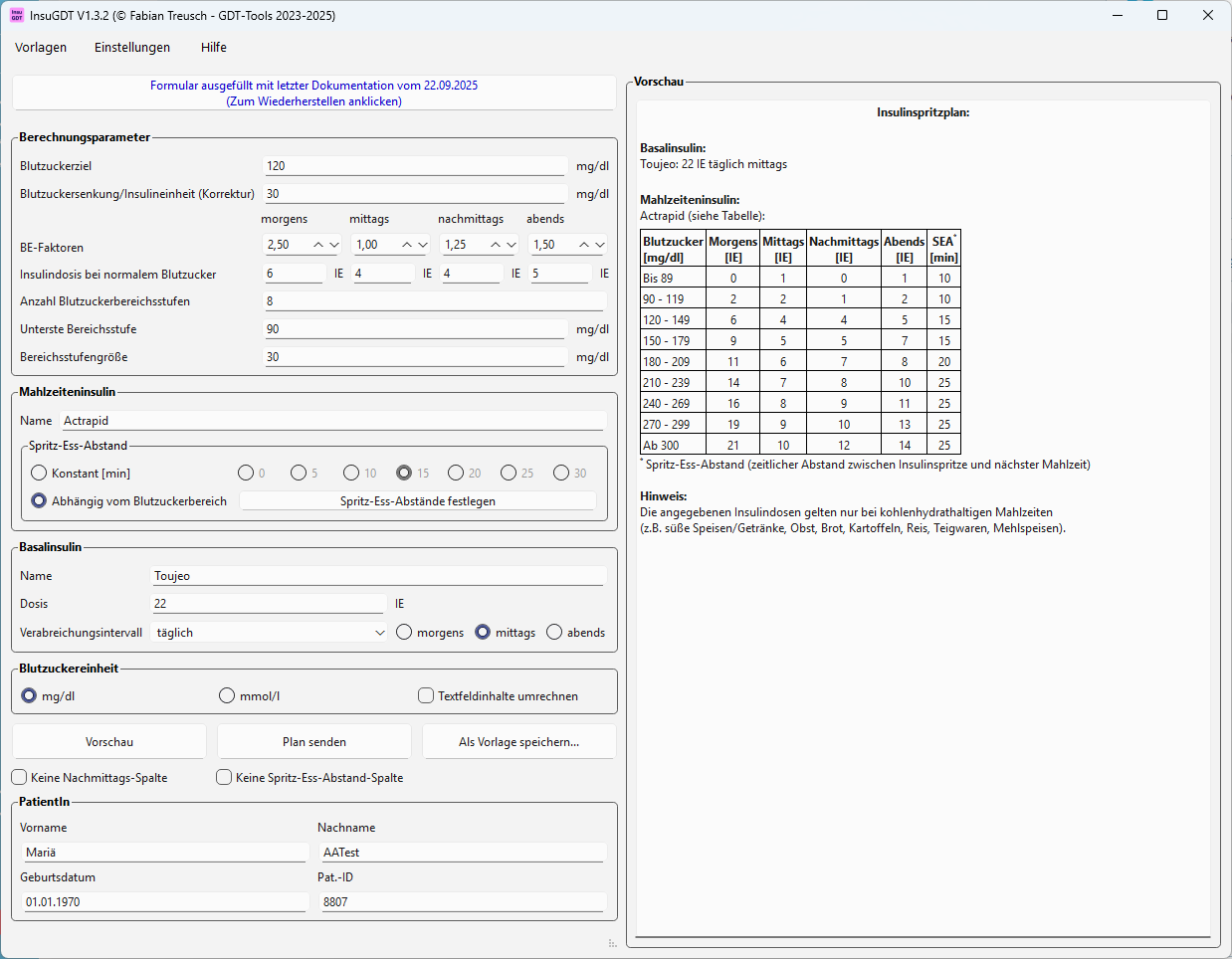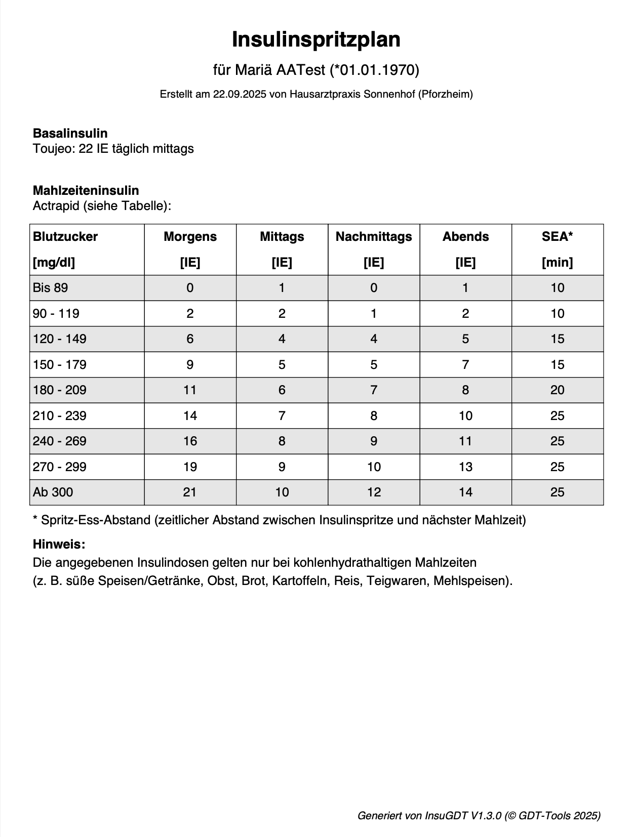 In der diabetologischen und hausärztlichen Praxis ist im Rahmen der intensivierten konventionellen Insulintherapie (ICT) bei PatientInnen mit Diabetes mellitus häufig die Erstellung von Insulinspritzplänen möglichst mit Angabe der Spritz-Ess-Abstände erforderlich. Für eine zuverlässige Umsetzung und damit erfolgreiche Therapie sollten die Pläne einerseits übersichtlich und für die PatientInnen gut lesbar sein. Andererseits sollten sie im Sinne der Therapieoptimierung schnell anpassbar sein. InsuGDT beschleunigt diese Prozesse im Vergleich zur manuellen Erstellung erheblich bei gleichzeitig reduzierter Fehleranfälligkeit.